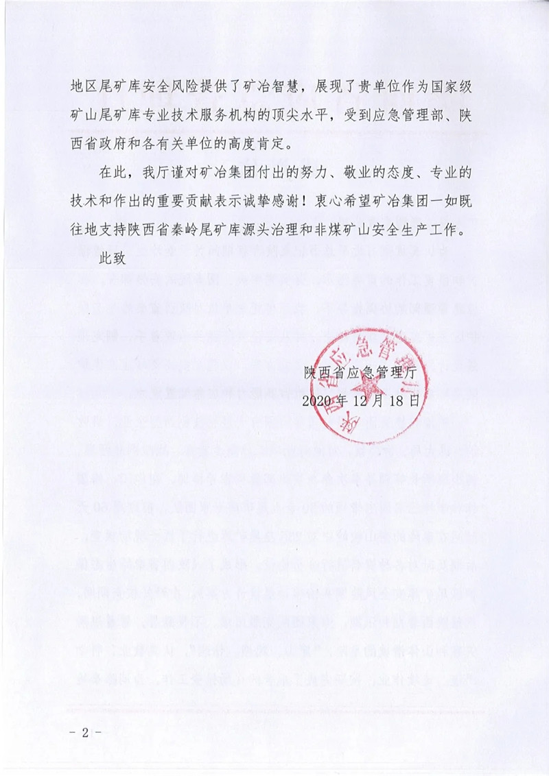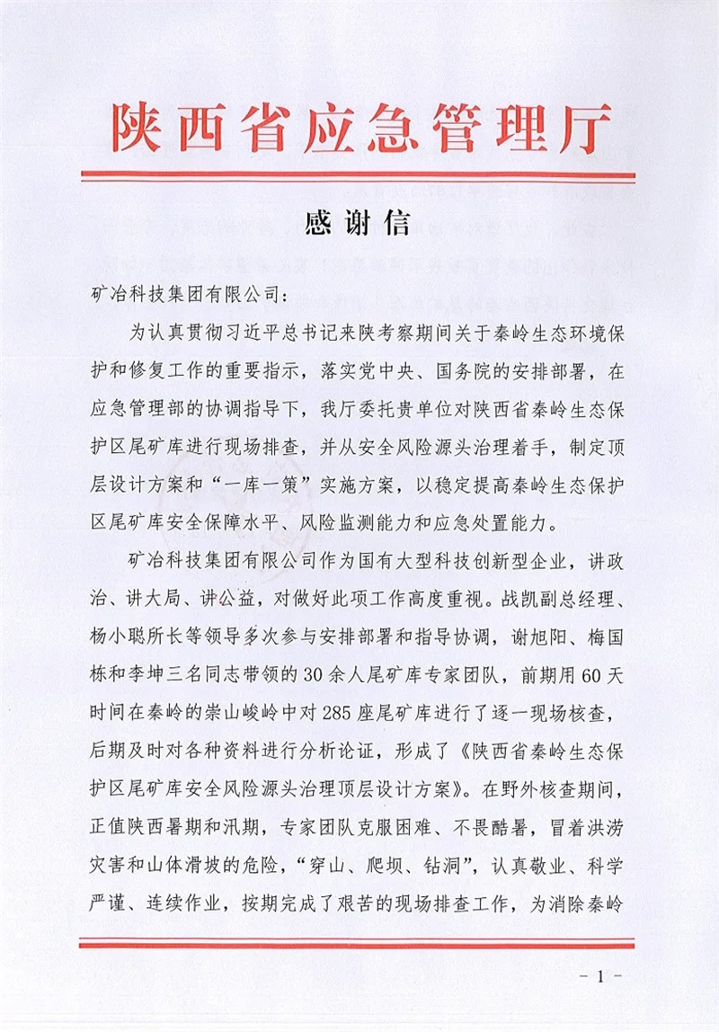 為認真貫徹習近平總書記在陜西考察期間關于秦嶺生態(tài)環(huán)境保護和修復工作的重要指示,礦冶集團受陜西省應急管理廳的委托對秦嶺地區(qū)的285座尾礦庫逐一進行了檢查,公司作為重要參與力量,先后派出多位同志參與現(xiàn)場檢查,檢查期間克服困難,不畏酷暑,“穿山、爬壩、鉆洞”,完成現(xiàn)場檢查工作后又認真編寫了“一庫一策”報告,為集團制定陜西省秦嶺生態(tài)保護區(qū)尾礦庫安全風險源頭治理頂層設計方案貢獻了公司力量。該項工作最終獲得應急管理部、陜西省各級應急管理部門和企業(yè)的認可與好評,陜西省應急管理廳為此特向礦冶集團發(fā)來感謝信,我公司將再接再厲為應急管理部門做好安全風險源頭治理工作提供有力技術支撐。